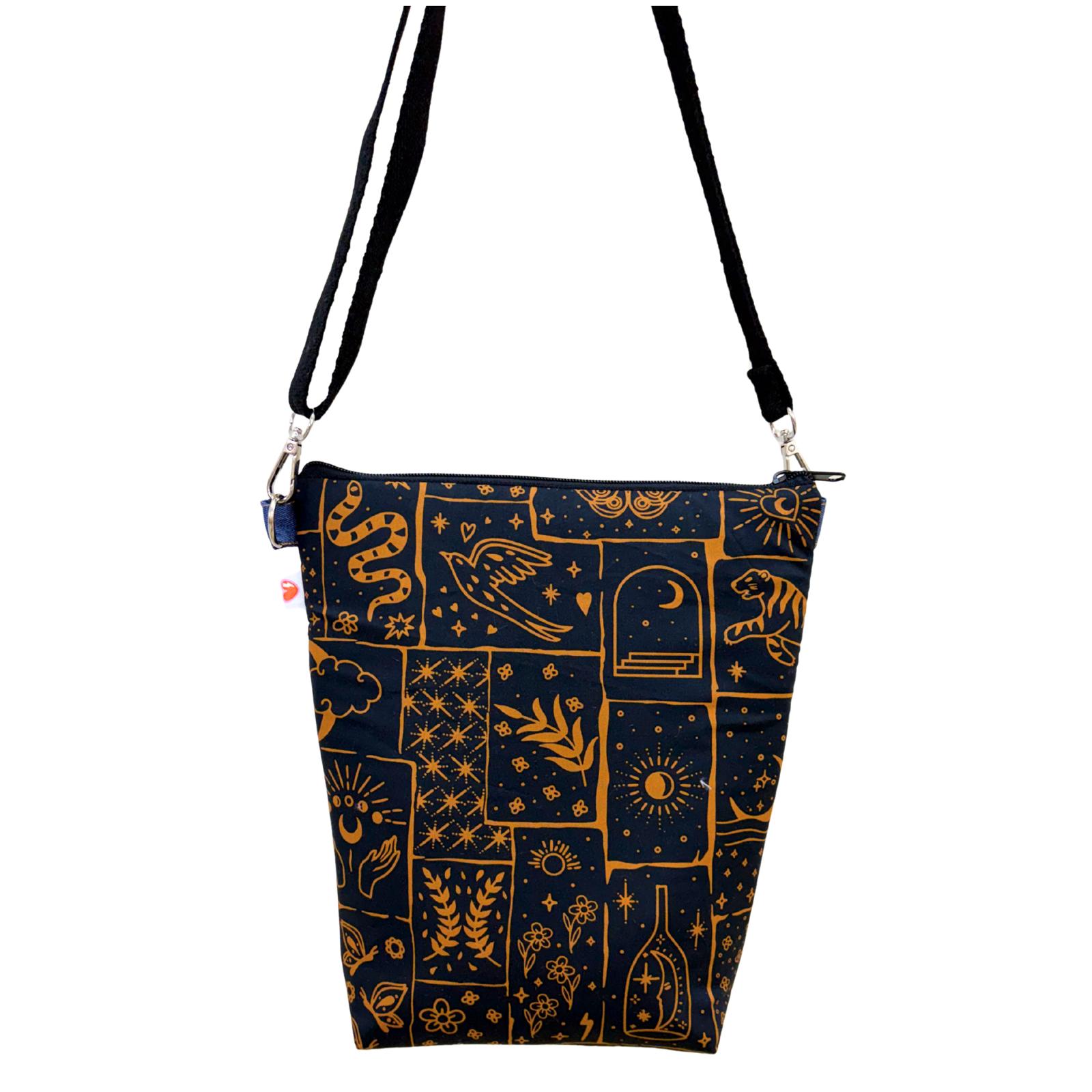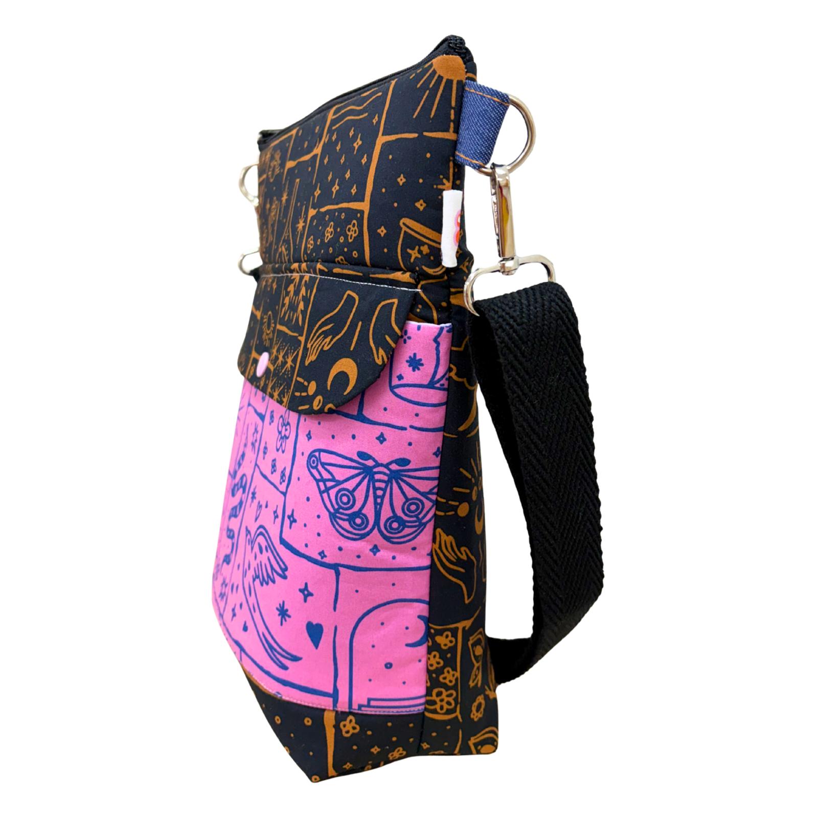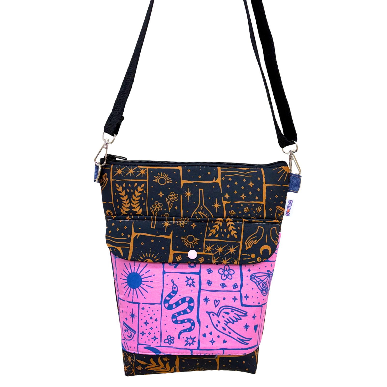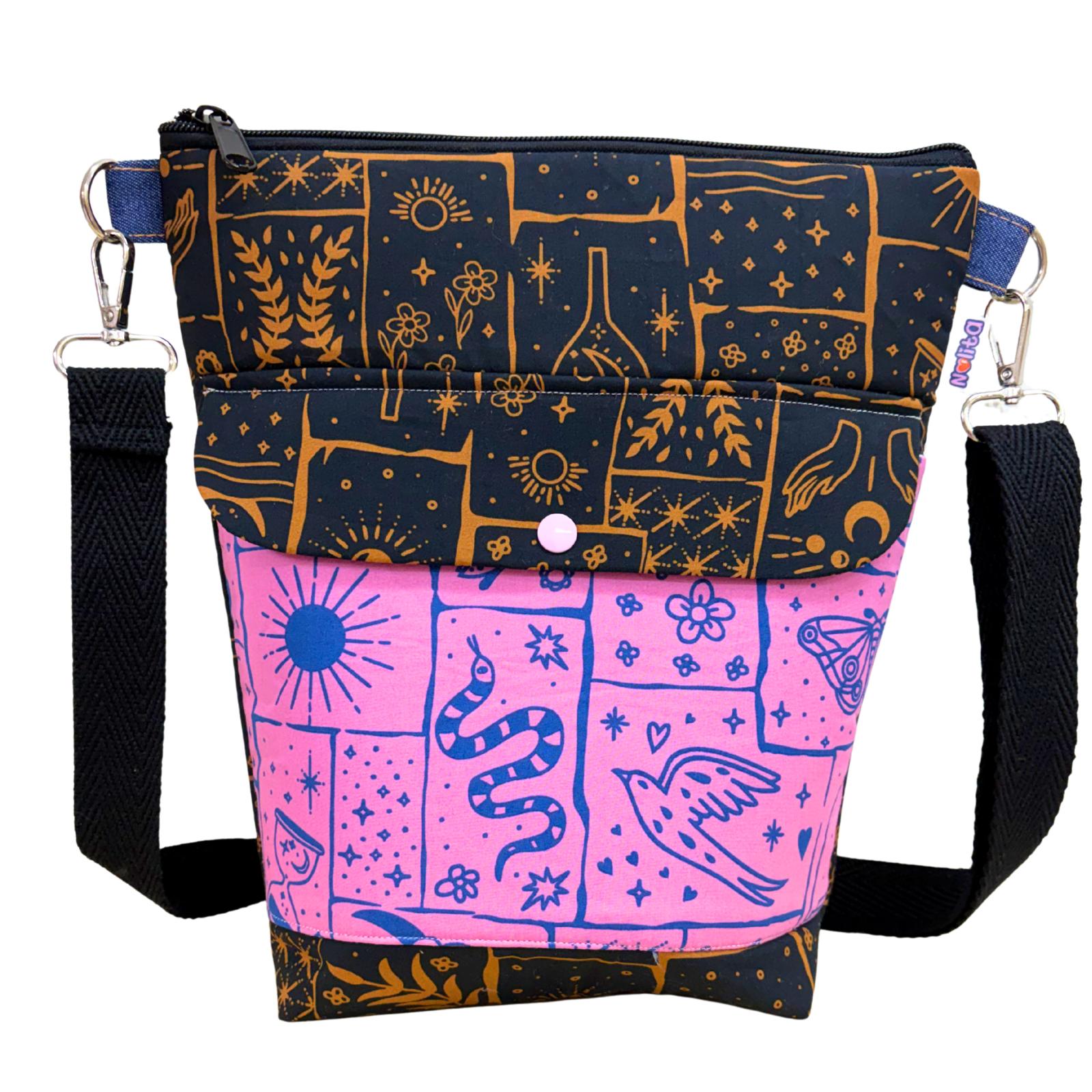 Su estampado mezcla símbolos cósmicos, tigres, soles, nubes y flores en una composición que parece sacada de un sueño místico. El contraste entre rosa intenso y los tonos oscuros crea una pieza magnética, llena de energía y personalidad.